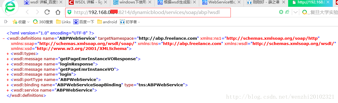 对于这个WSDL文档的学习,第一次看是感觉非常陌生的,而且里面元素又多,学习的话先是要了解外层结构代表的意义和作用,然后理解里面的元素的意义和作用,有些元素作用不大,有些元素又是很关联的,有些元素是比较重要的。