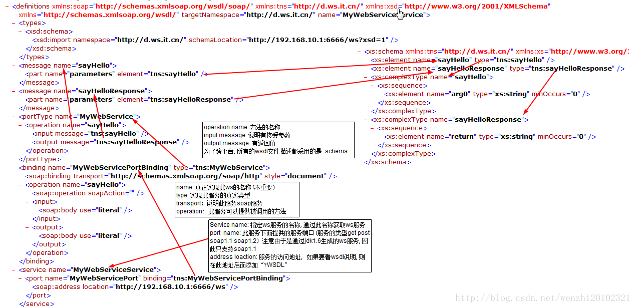 这里sayHelloResponse是和sayHello相关的,sayHello相对于一个方法,里面的: type=”xsd:string”,name=”name”,是确定传入name的参数是String类型的,而sayHelloResponse中的 name=”return” type=”xsd:string” 是确定方法sayHello(String name)返回的类型是String类型的。
