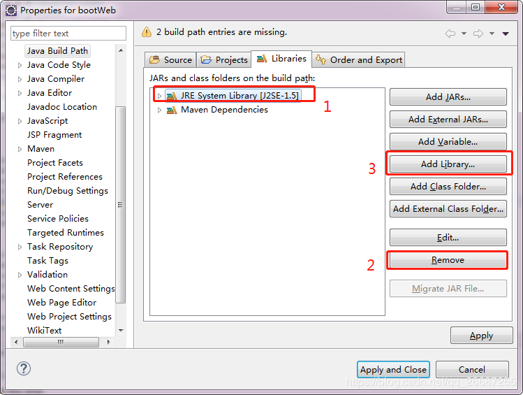 选择JRE System Library,Remove,然后Add Library,加上自己环境的jdk