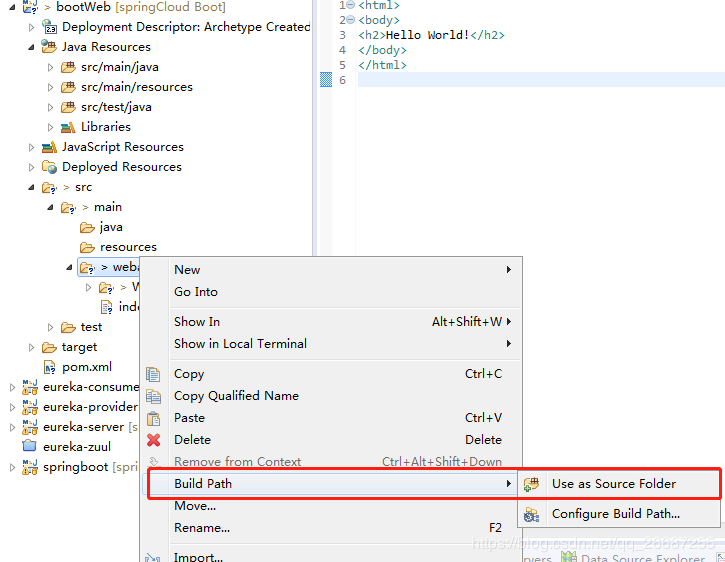 好,我们继续,右键webapp - Build Path - Use as Source Folder,把webapp变成资源文件,以便项目加载