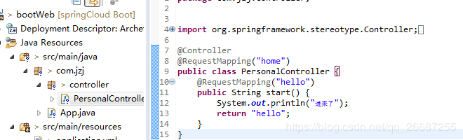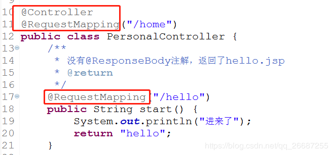 3、所以,当我们访问localhost:8080/home/hello,就会走PersonalController下的start()方法,返回hello