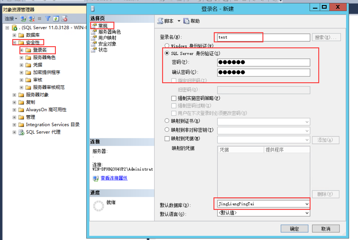 5、安全对象和状态默认,不用设置(有特殊情况在设置),然后点击确定生成新的登录名test