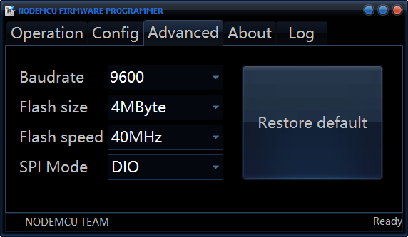 点击 Advanced ,其中 Baudrate 可在 esp8266 的背面找到具体数值,我这里是 9600。