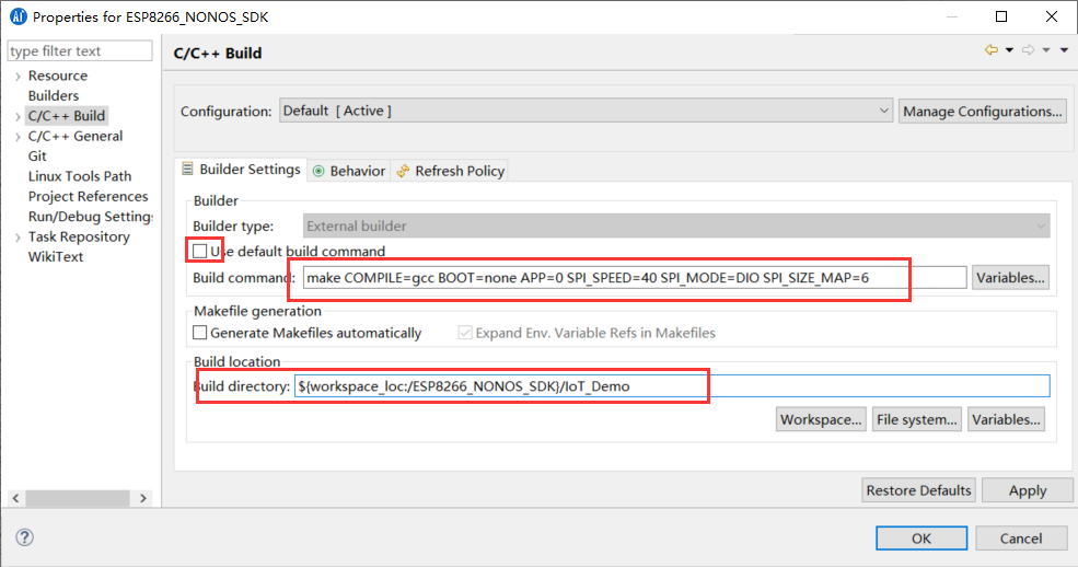 5、鼠标选中项目名称右击,在右侧菜单中选择 Properties --> C/C++ Build --> Build command 中添加编译规则。当前硬件是 32Mbit 的模块,所以填写:make COMPILE=gcc BOOT=none APP=0 SPI_SPEED=40 SPI_MODE=DIO SPI_SIZE_MAP=6