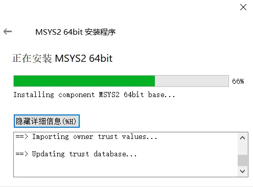 安装过程中,我们可能会发现,进度会一直卡在中间,无法继续执行,然后“隐藏详细信息”这里显示“Updating trust database”,如下图所示。当遇到这个问题时,我们只要点击右下方的“取消”按钮,然后重新安装即可。