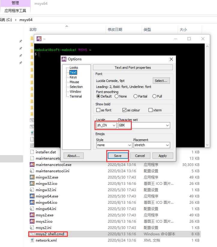 进入安装目录,打开 msys2_shell.cmd,在弹出的窗口上右击, 选择 Options,按照如下设置更改字符集,更改完成后,点击“Save按钮”,这里要注意更改完成后得要重新启动 msys2_shell.cmd,设置才能生效。