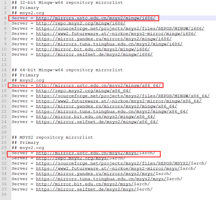 mirrorlist.mingw64:Server = http://mirrors.ustc.edu.cn/msys2/mingw/x86_64/