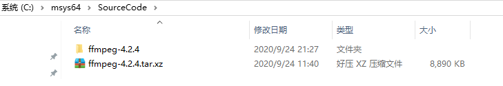 在 msys2 的安装目录下新建一个文件夹 SourceCode(名称随便),将下载下来的 FFmpeg 源码解压,放到该文件夹下,如下图所示:
