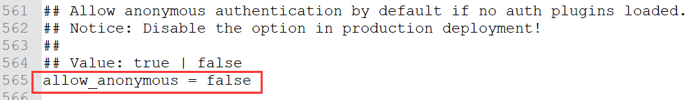 vim /etc/emqx/emqx.conf,allow_anonymous 修改为 false。
