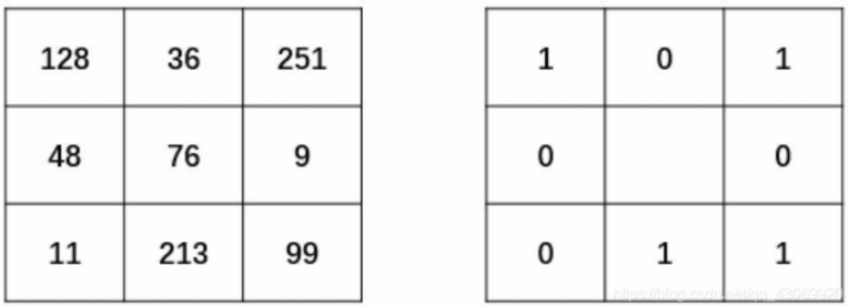 ● 将像素值大于76的像素点处理为1。例如,其邻域中像素值为128、251、99、213的点,都被处理为1,填入对应的像素点位置上。