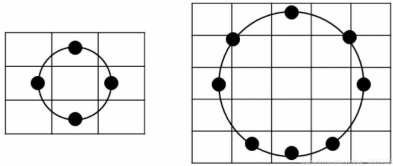 ● 右侧使用的是(8, 2)邻域,比较当前像素与邻域内8个像素点的像素值大小,使用的半径是2。在参与比较的8个邻域像素点中,部分邻域可能不会直接取实际存在的某个位置上的像素点,而是通过计算构造一个“虚拟”像素值来与当前像素点进行比较。