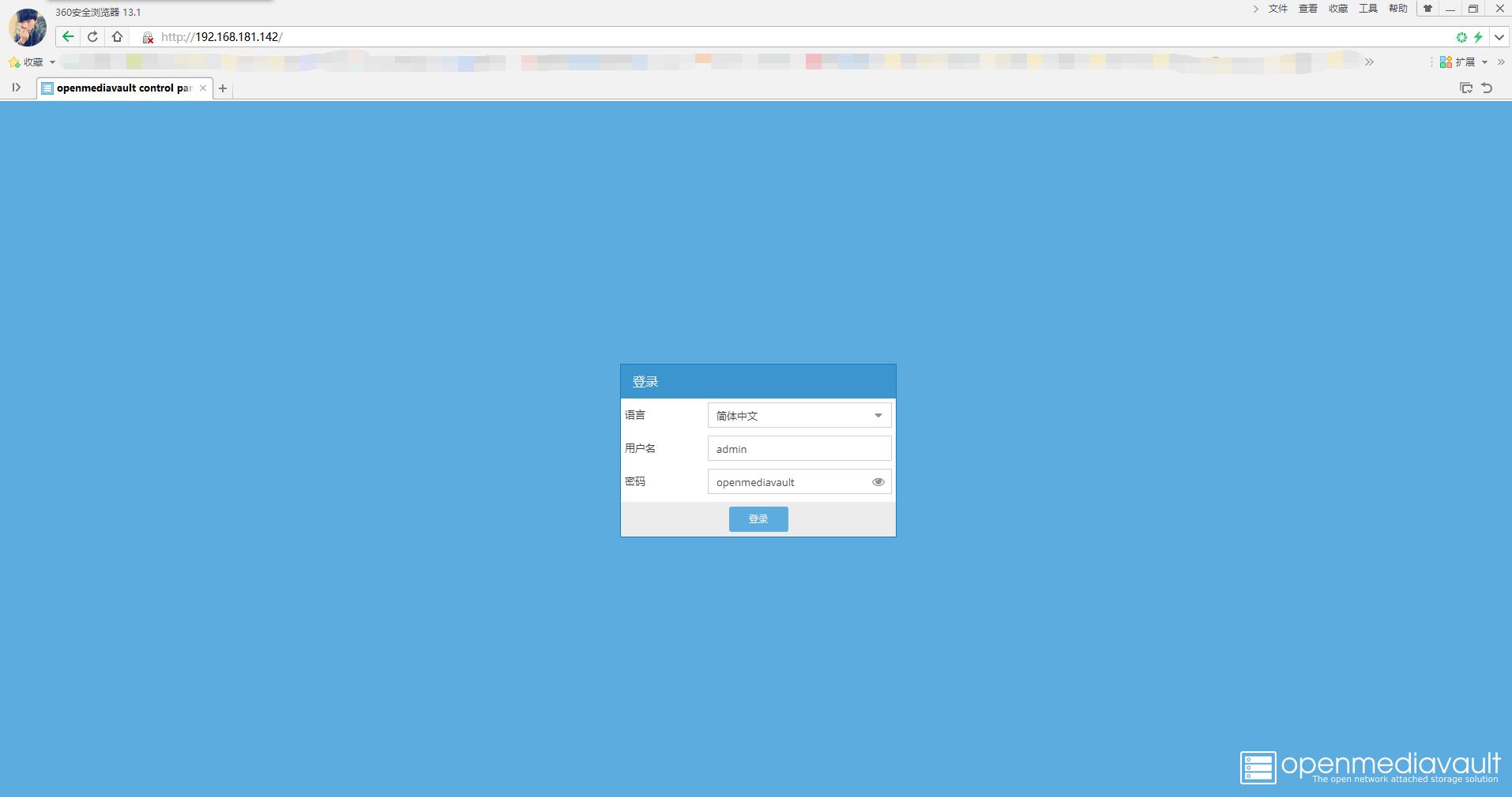 3、安装完毕,浏览器登录 openmediavault(默认用户名:admin,密码:openmediavault)