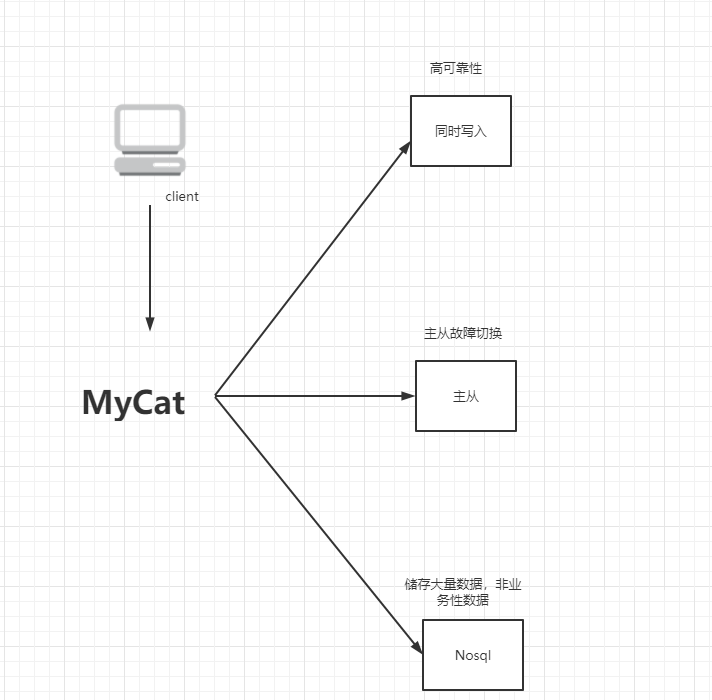 比如像一些非常重要的订单、账单等数据,我们可以让mycat同时写入到多个数据库,保证数据的高可靠性。也可以让mycat对一些数据进行多个主从的复制,有多个主从数据进行同步,当有一个主机坠机的时候,另外的主机进行切换保障数据安全。另外我们可以用mycat连接到Nosql,当我们有一些非业务性的数据比如日志等的数据储存到Nosql中。