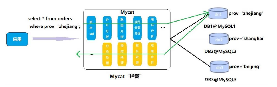 Mycat 的原理中最重要的一个动词是“拦截”,它拦截了用户发送过来的 SQL 语句,首先对 SQL语句做了一些特定的分析:如分片分析、路由分析、读写分离分析、缓存分析等,然后将此 SQL 发往后端的真实数据库,并将返回的结果做适当的处理,最终再返回给用户。这种方式把数据库的分布式从代码中解耦出来,程序员察觉不出来后台使用 Mycat 还是 MySQL。